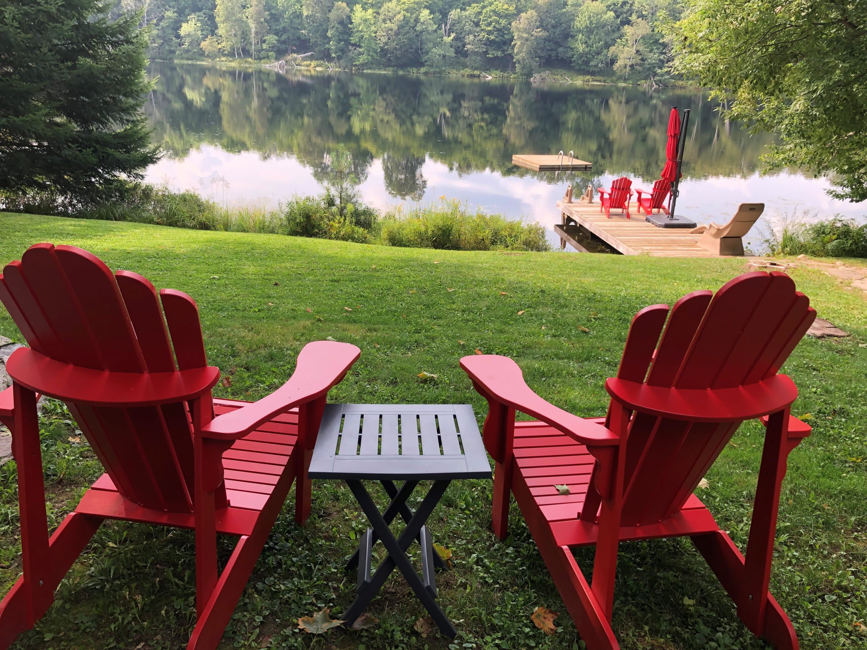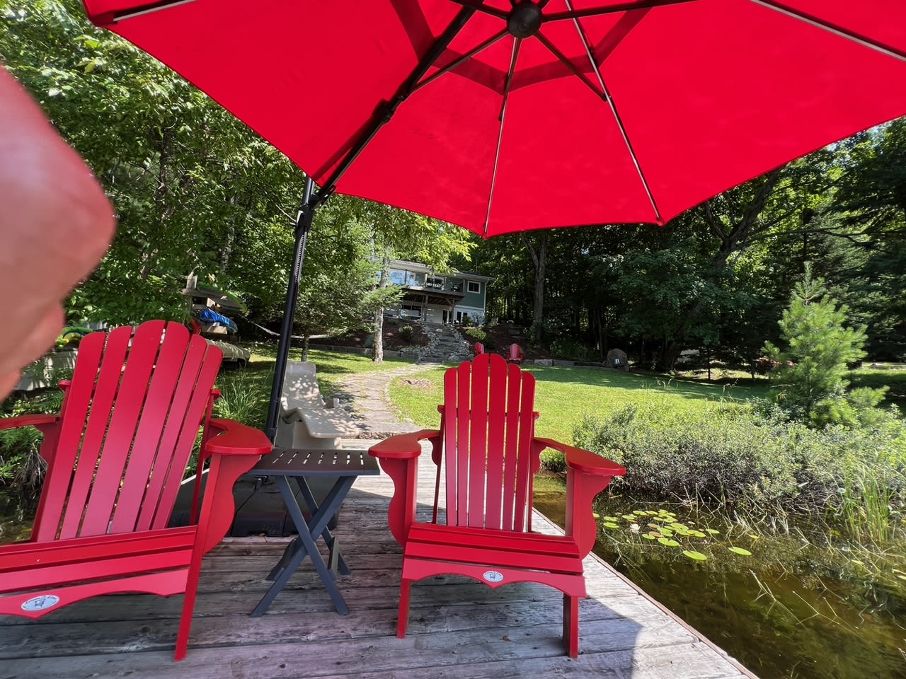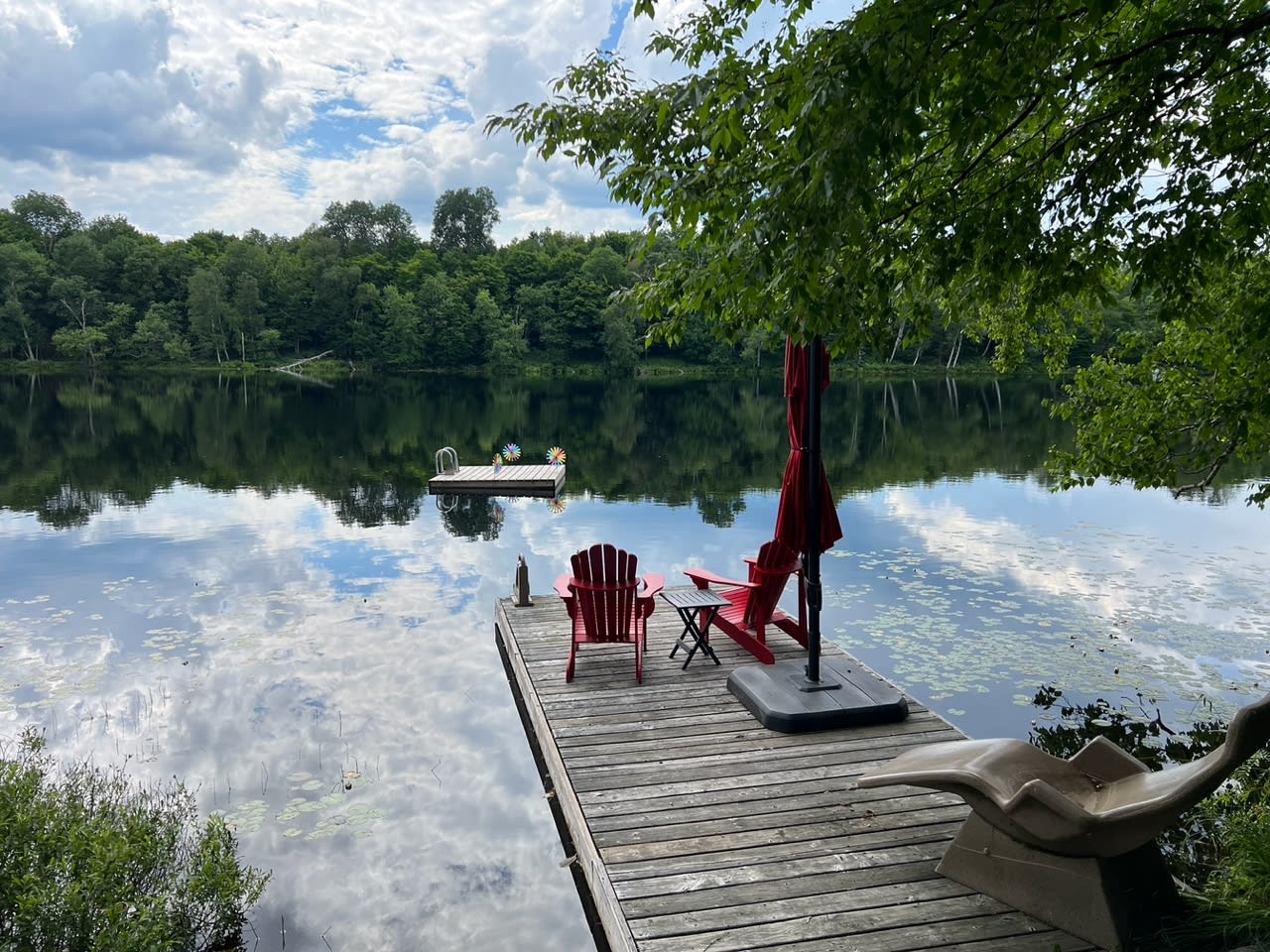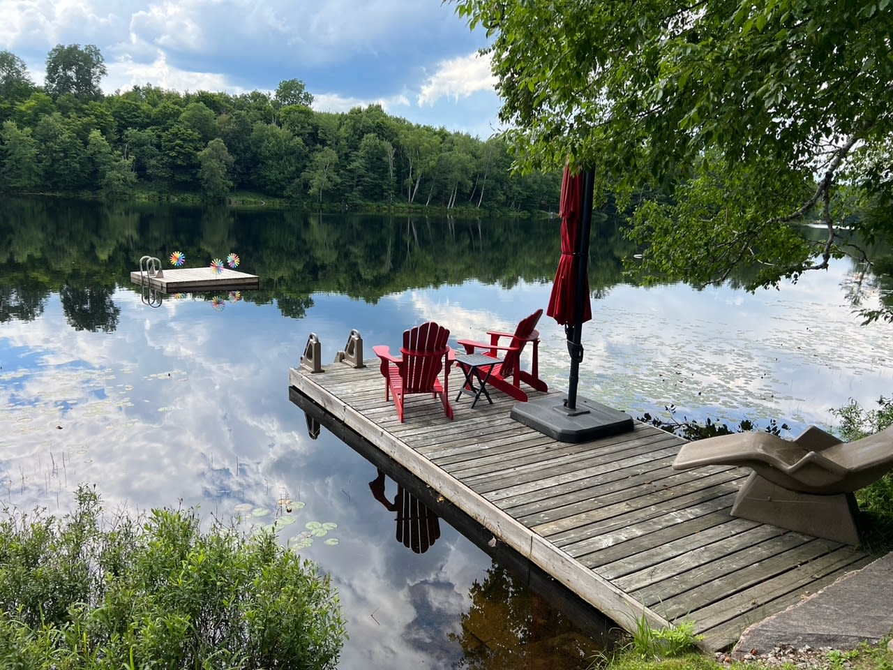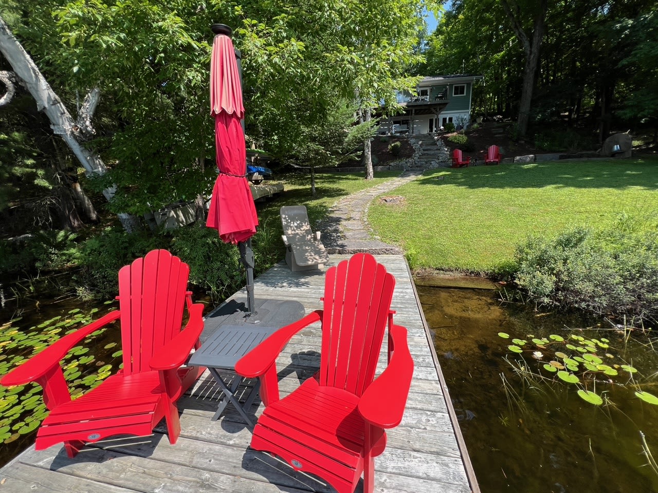 • 2 Muskoka chairs, lounger and stand-up umbrella on dock