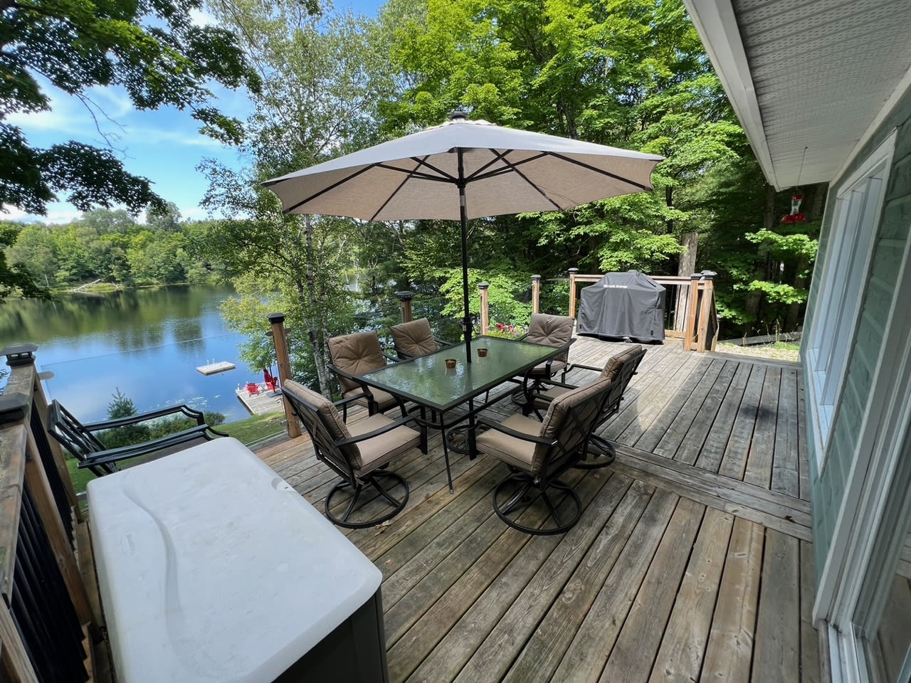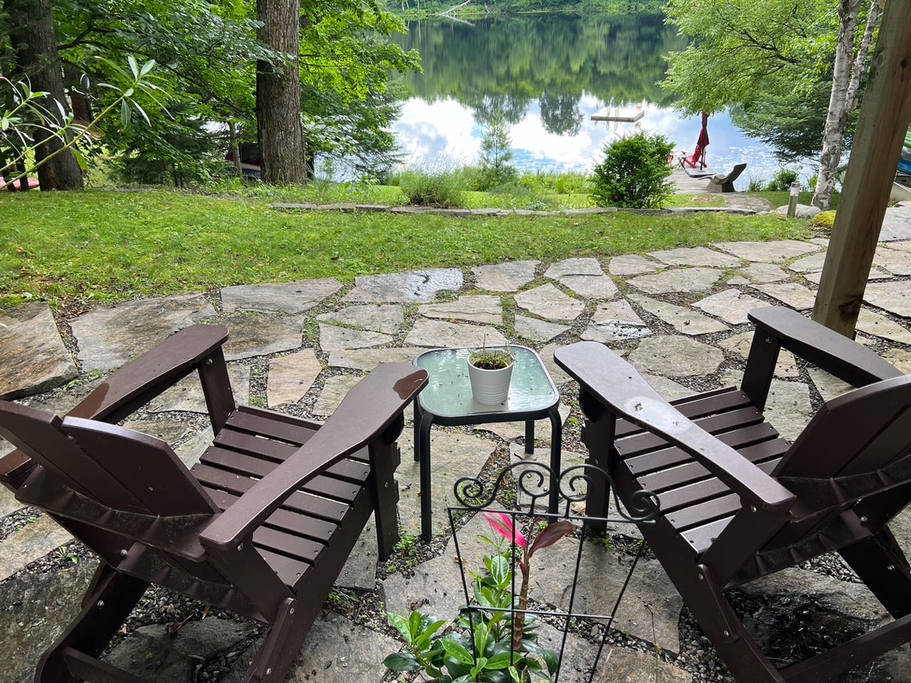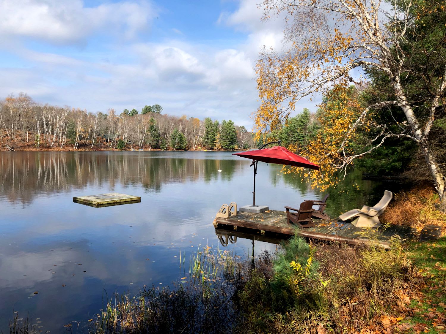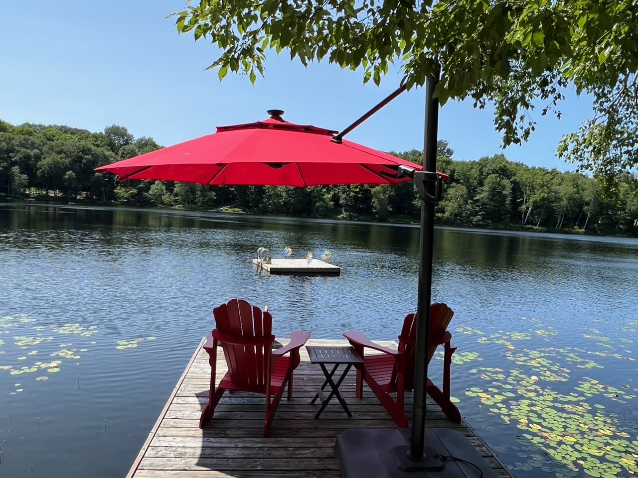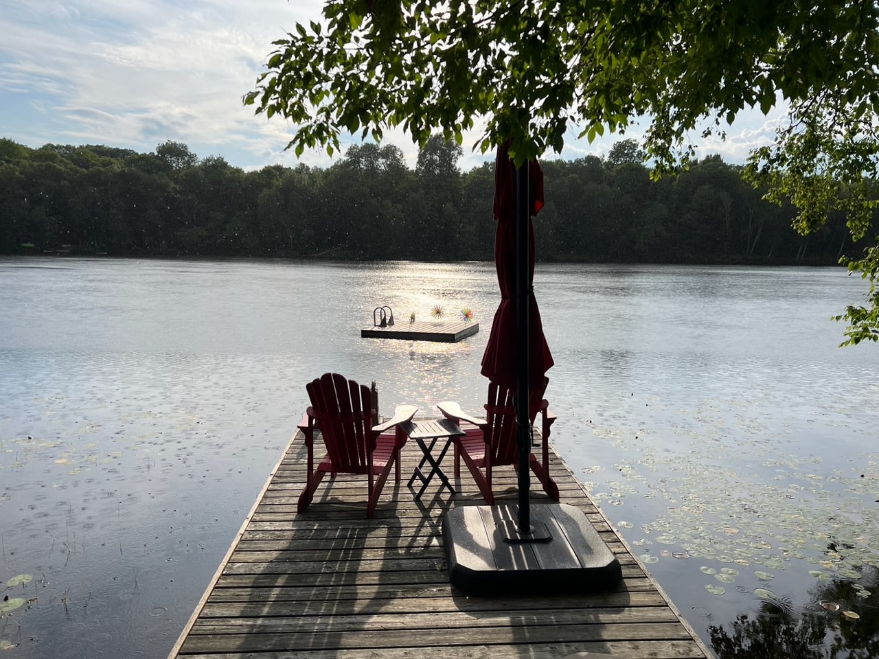 • 2 Muskoka chairs, lounger and stand-up umbrella on dock
