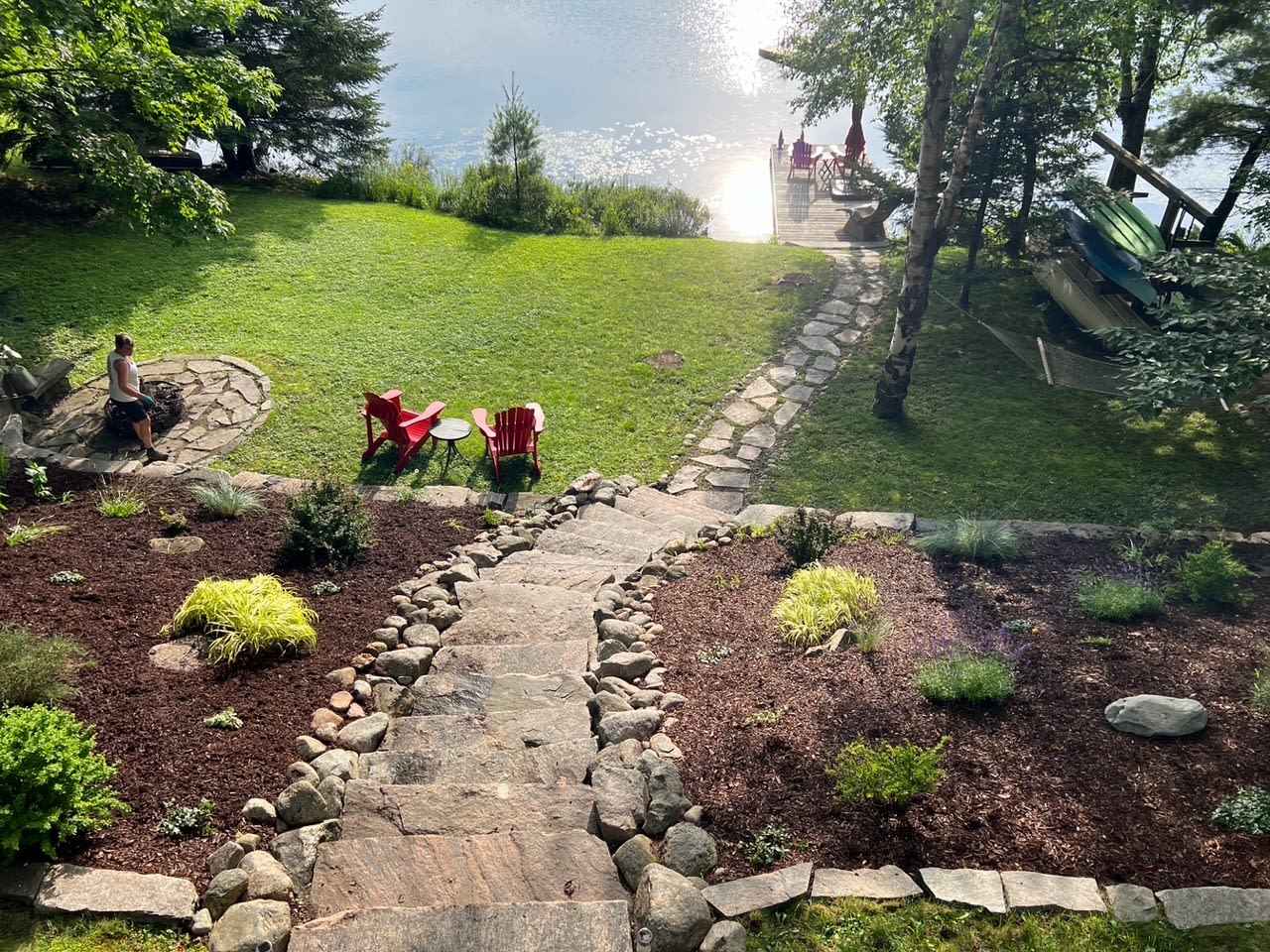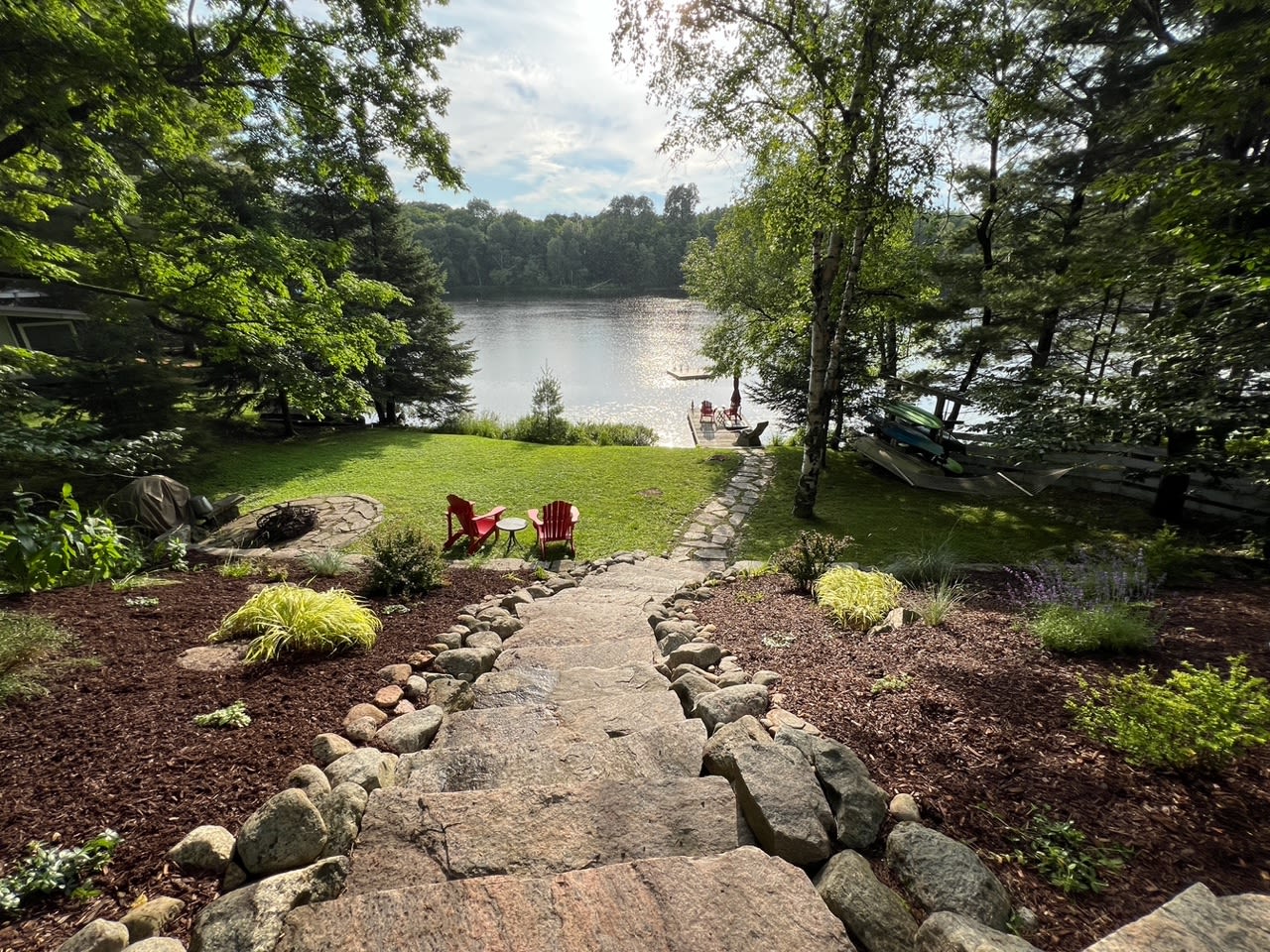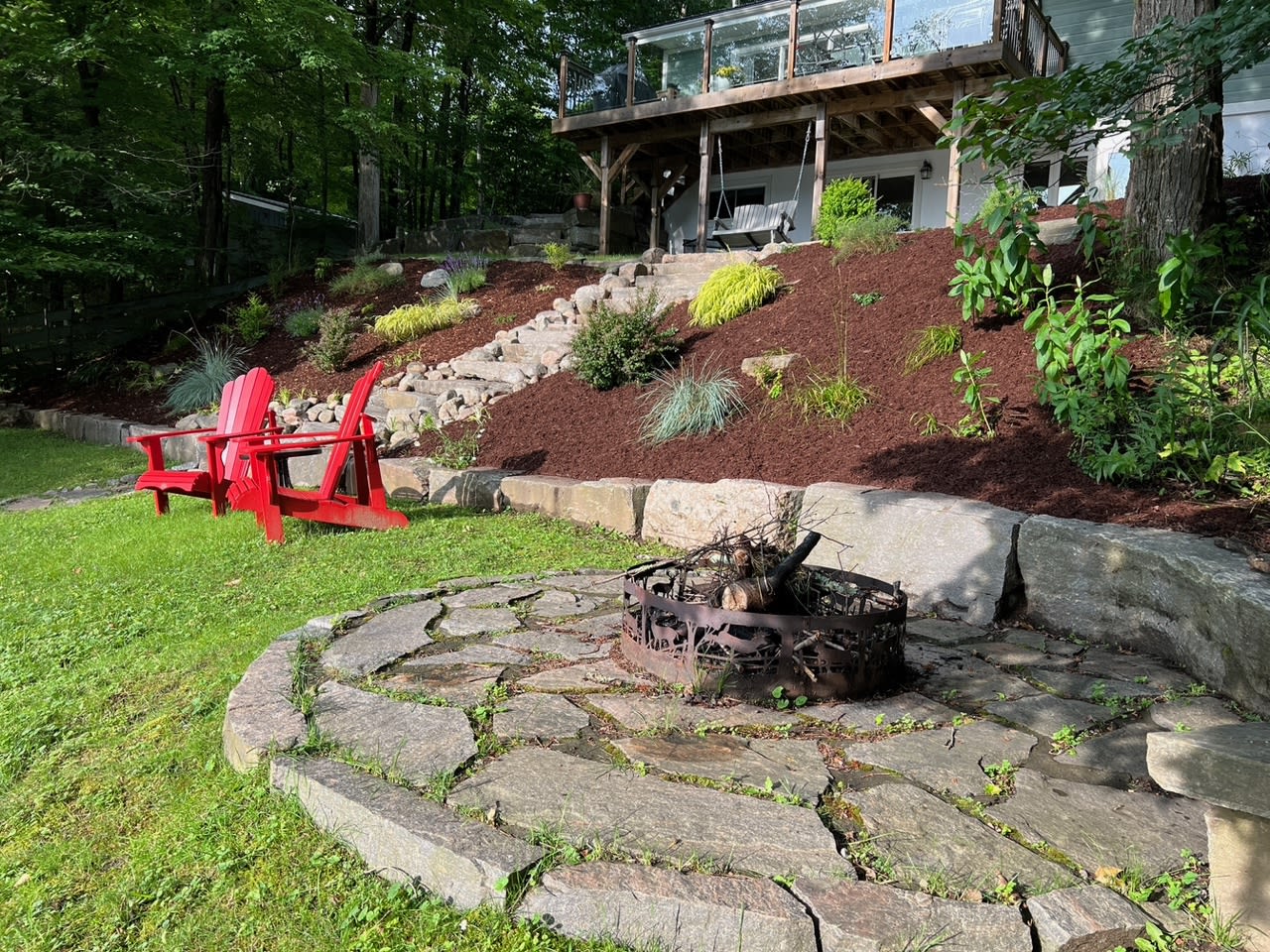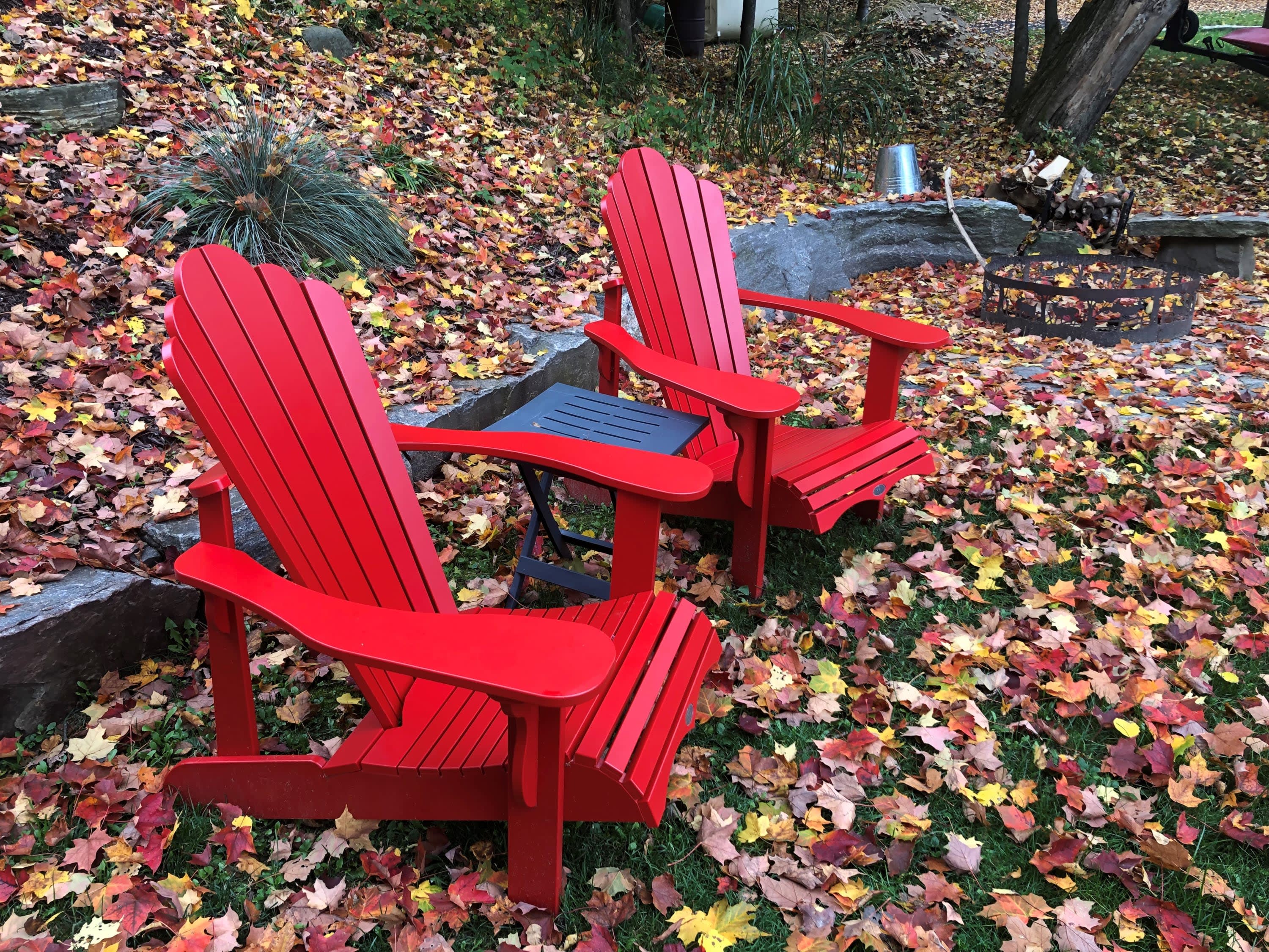 • 2 Muskoka chairs and armour stone bolders at fire pit