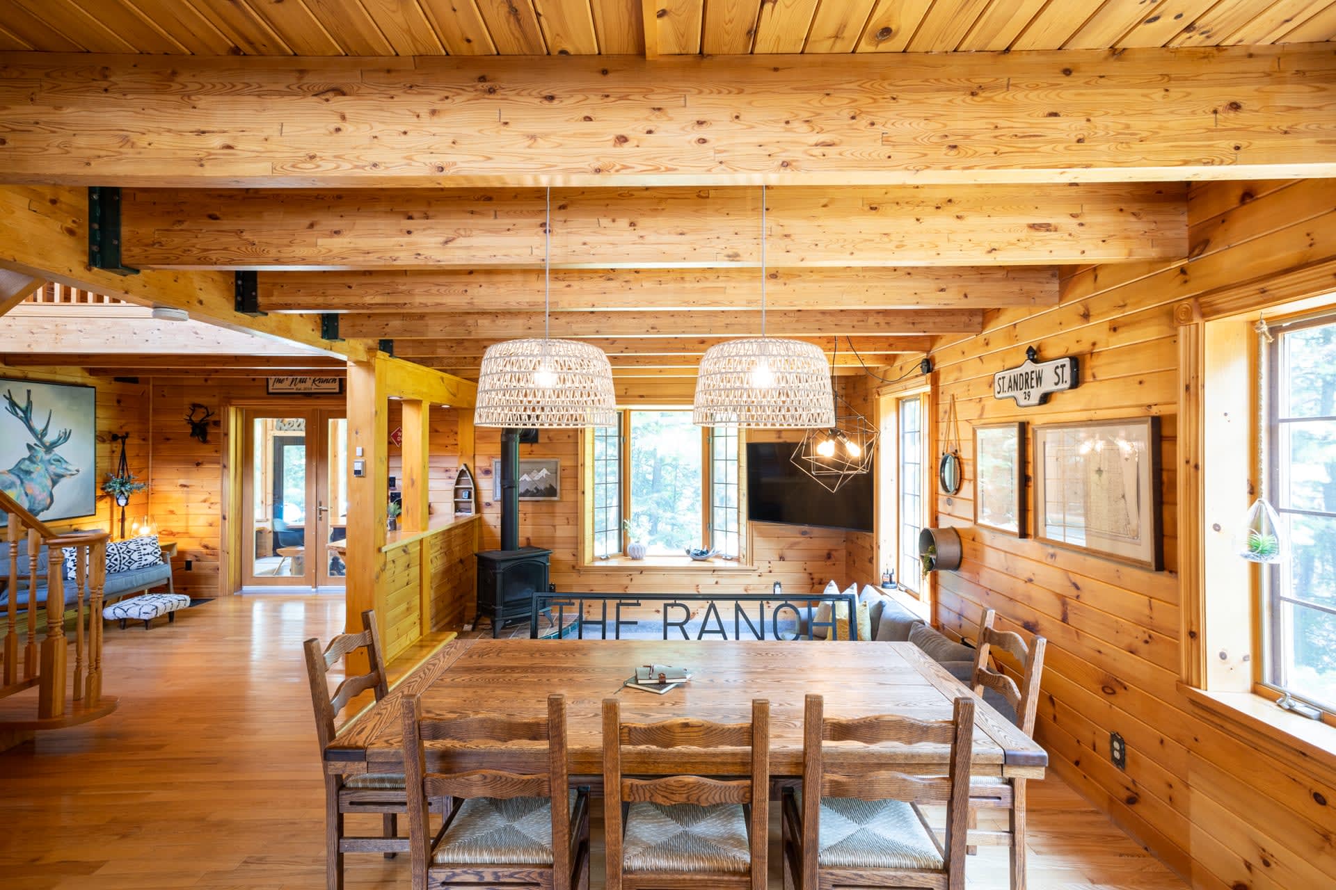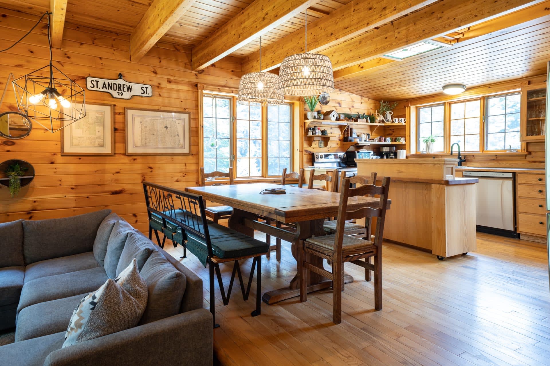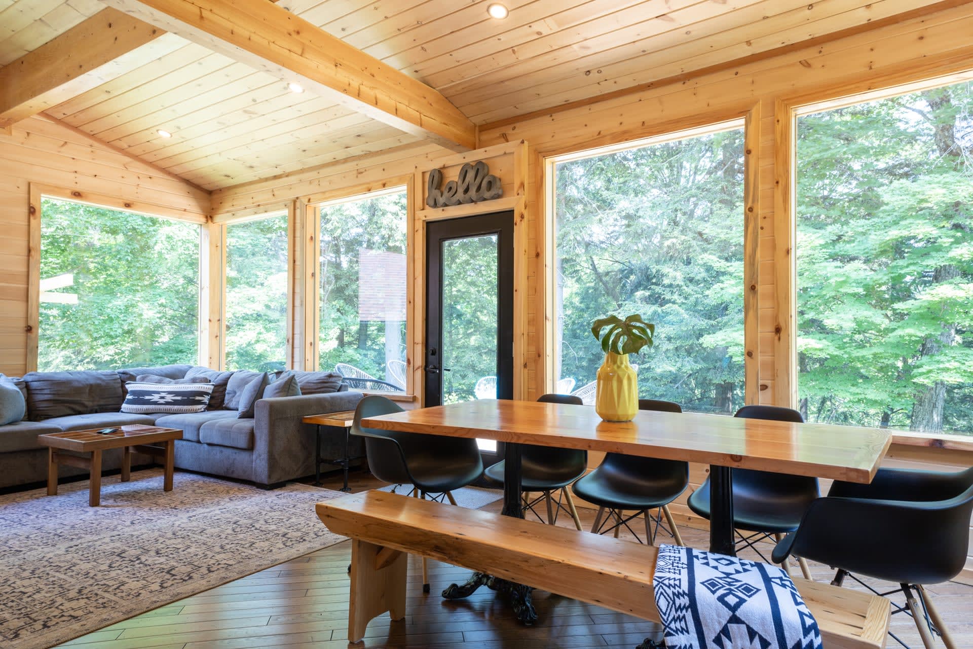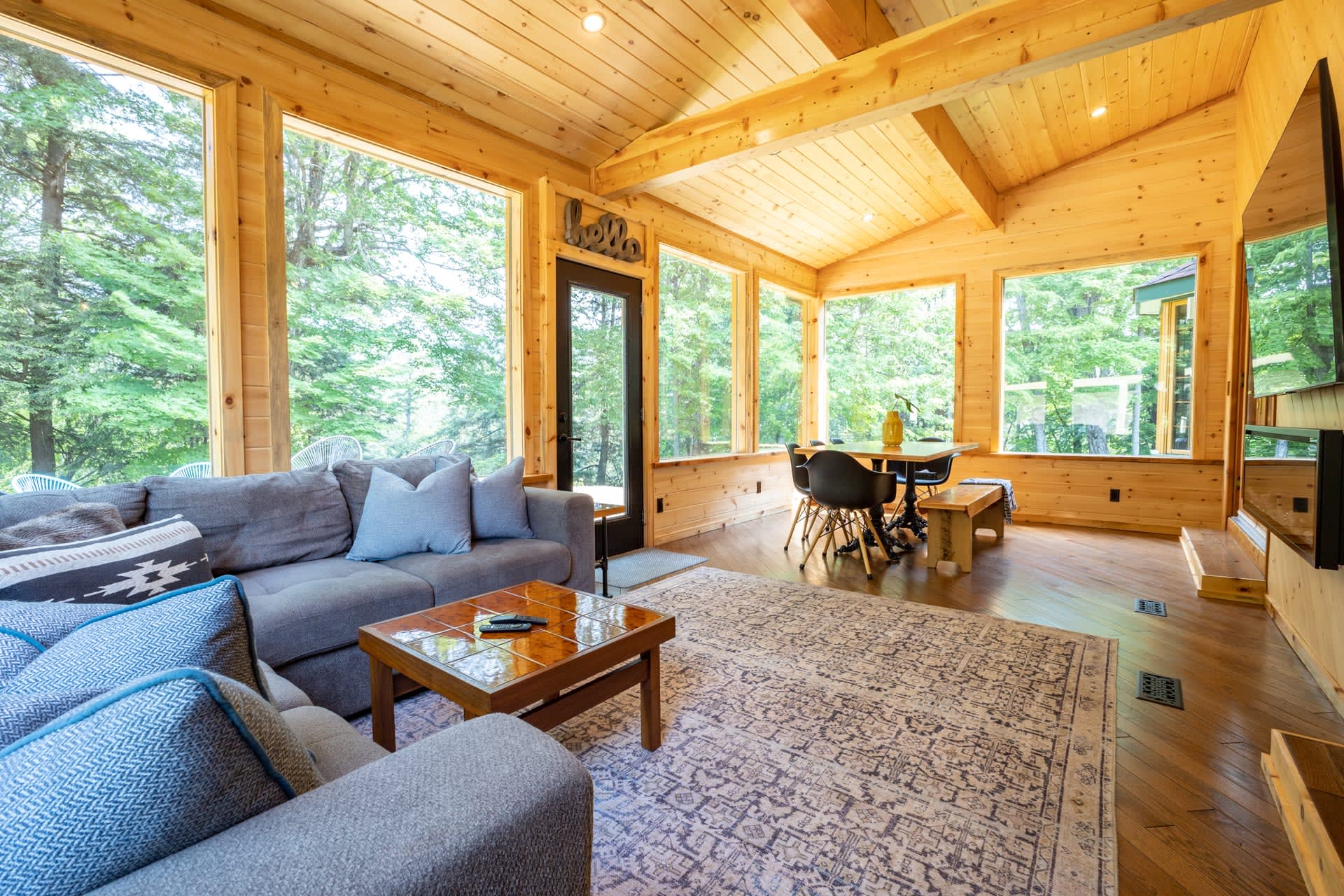 Muskoka room with sitting area and dining table with 5 chairs and long bench