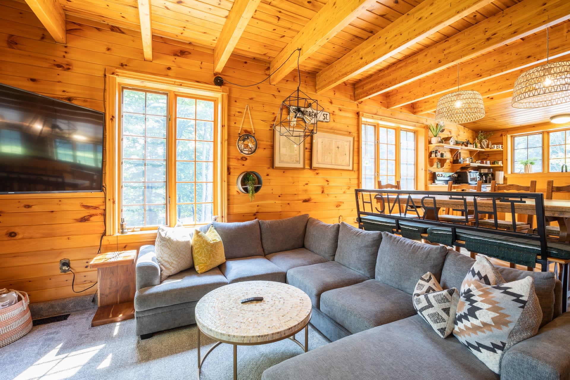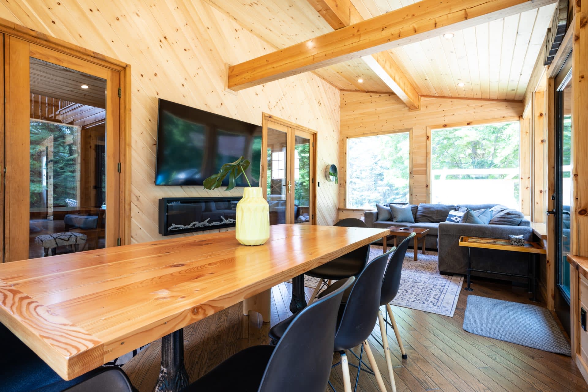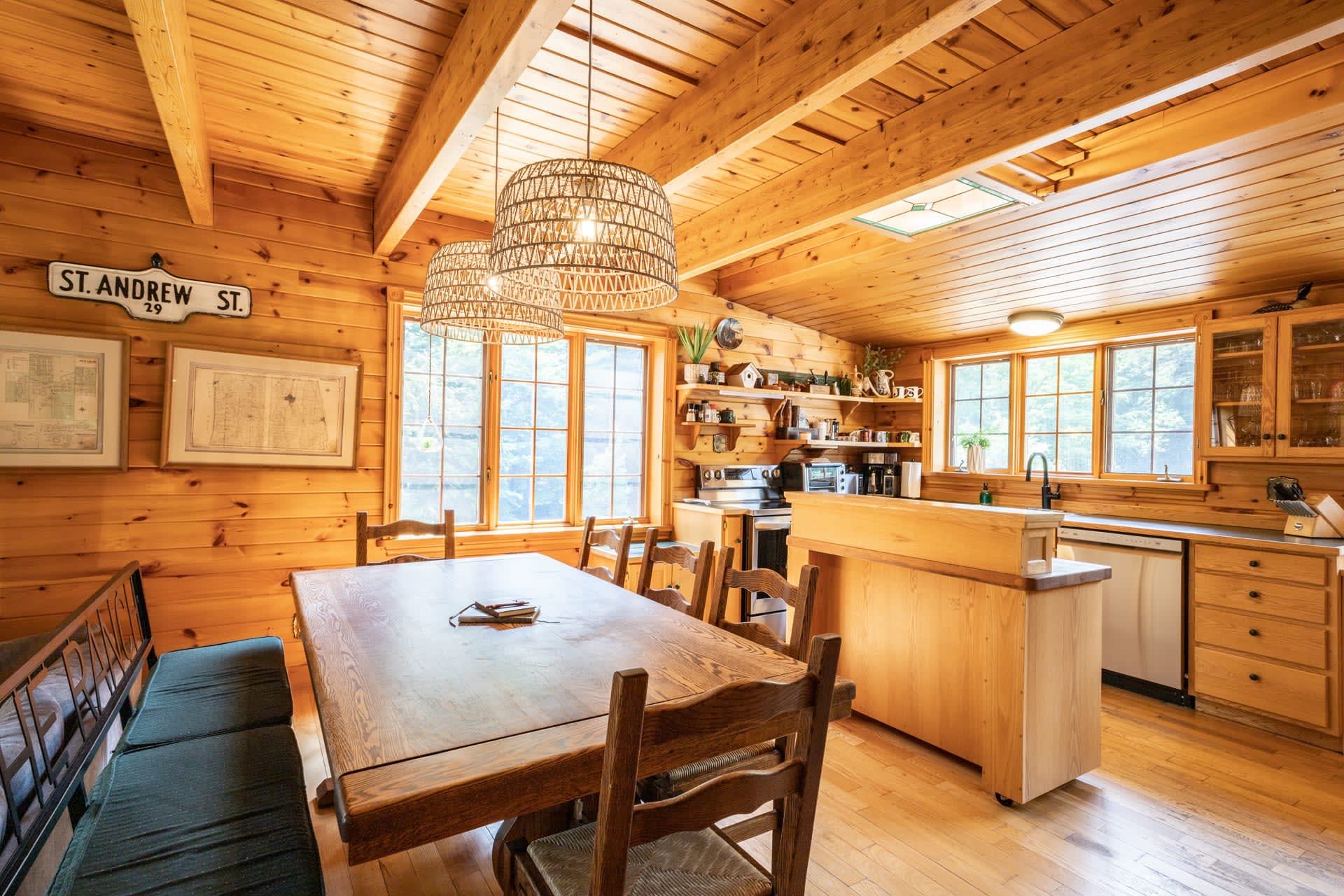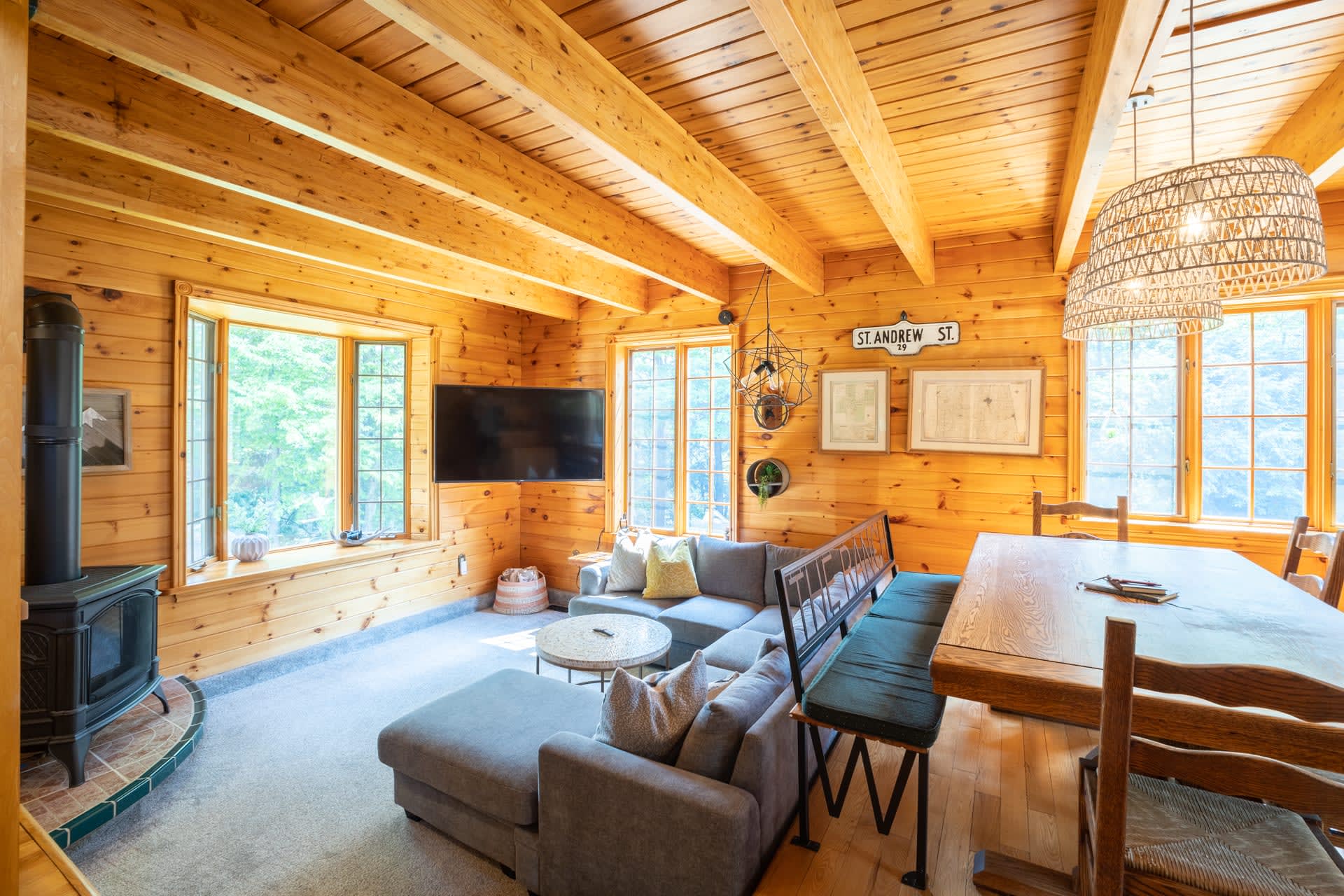 Muskoka room with sitting area and dining table with 5 chairs and long bench