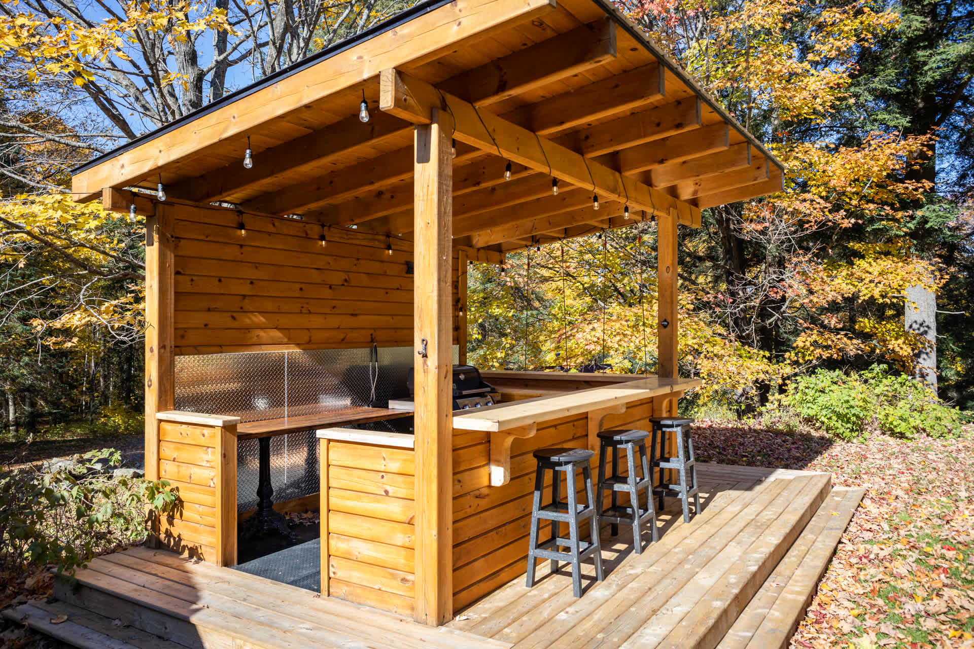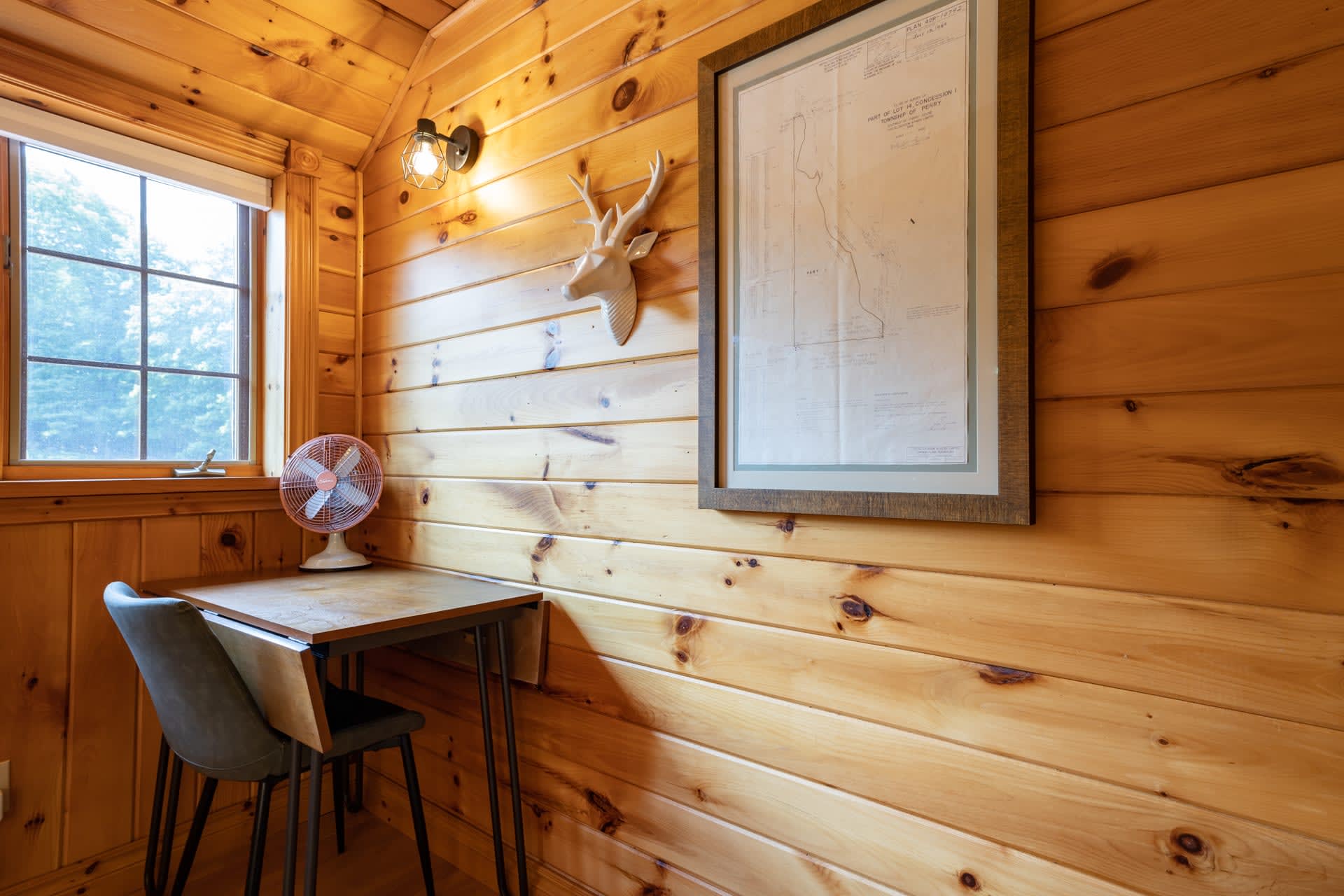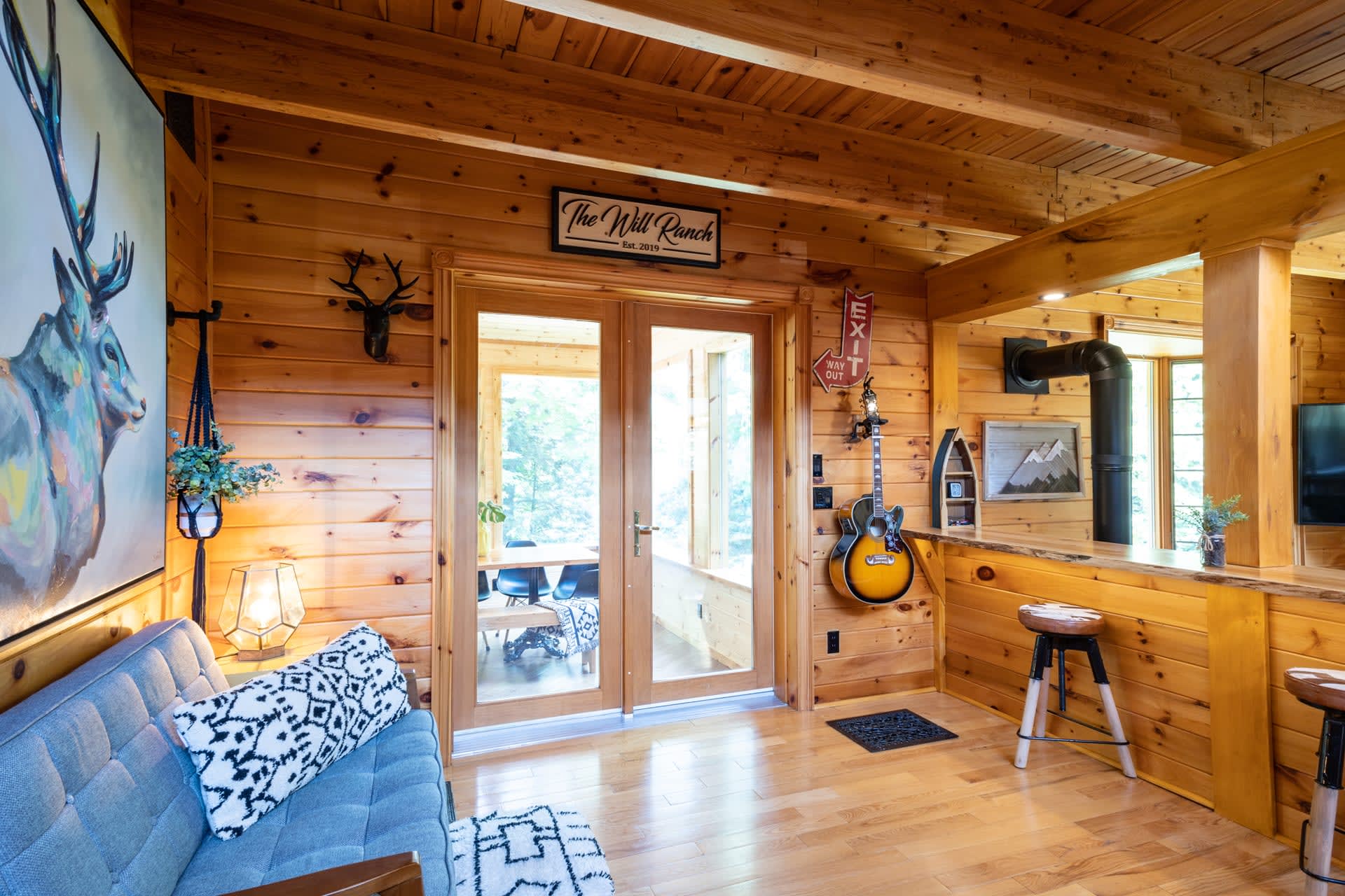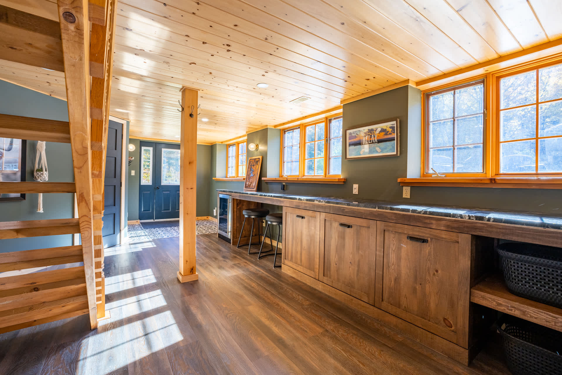 Muskoka room with sitting area and dining table with 5 chairs and long bench