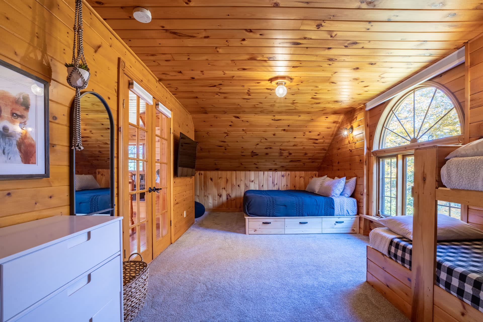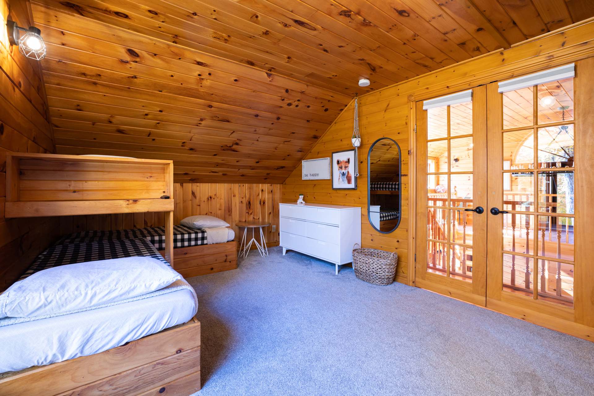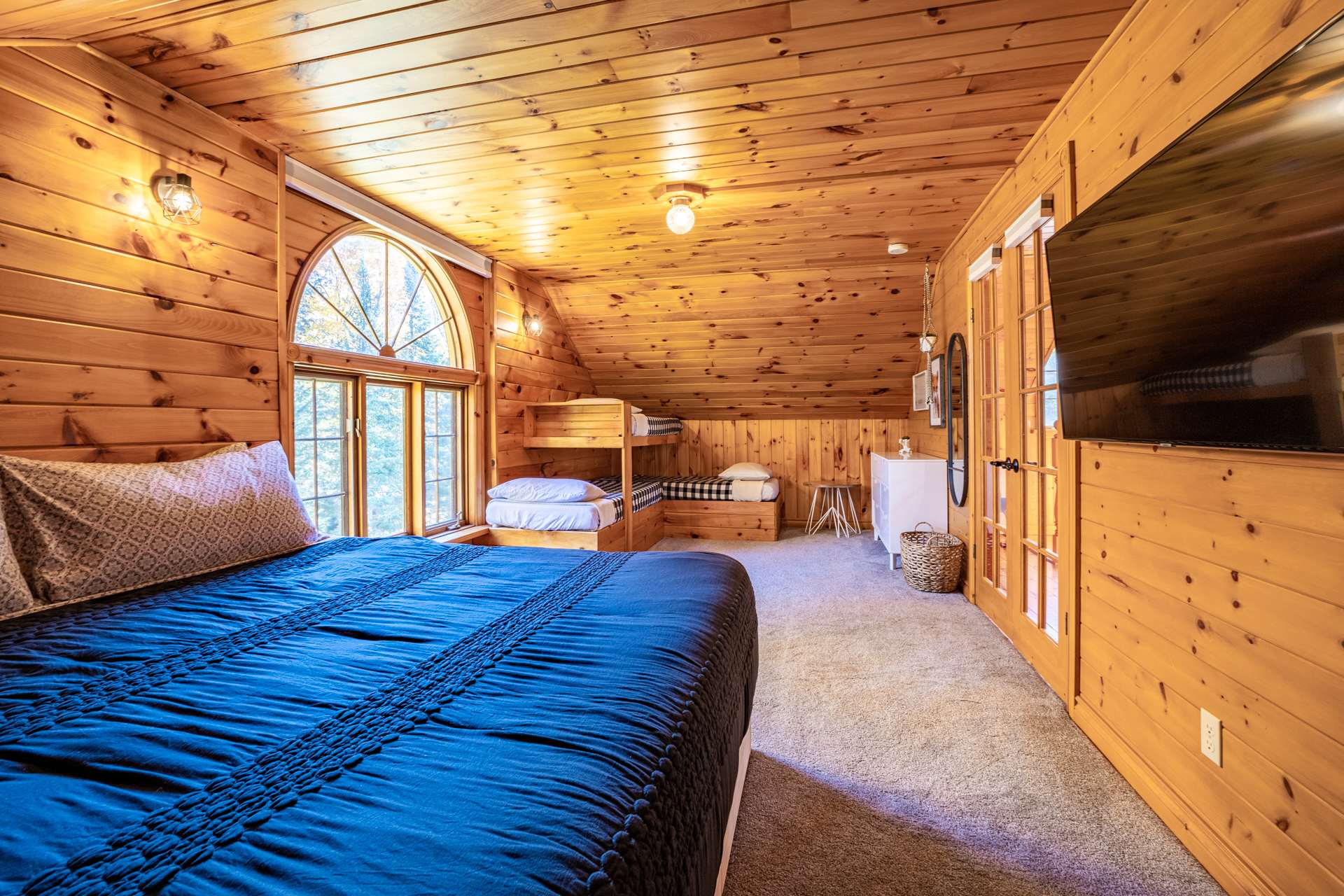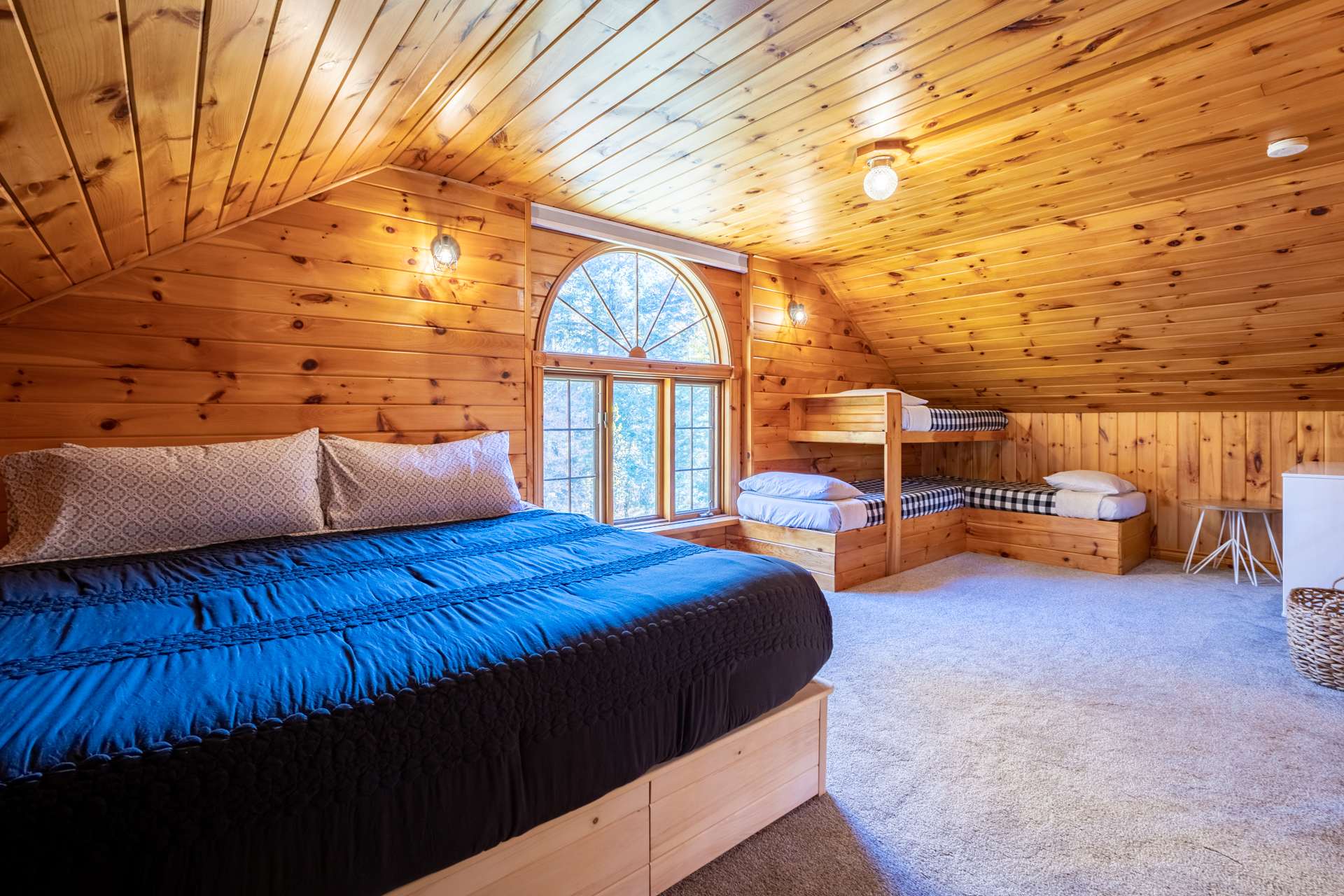 4 bedrooms (main level - queen; upper level - king; 3 built-in bunk beds, 1 King; lower level - queen