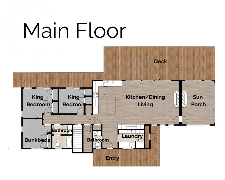 • 5 Bedrooms in main cottage (king-main floor; king-main floor; 2x twin XL/twinXL bunkbed-main floor; queen-second floor; queen-second floor)