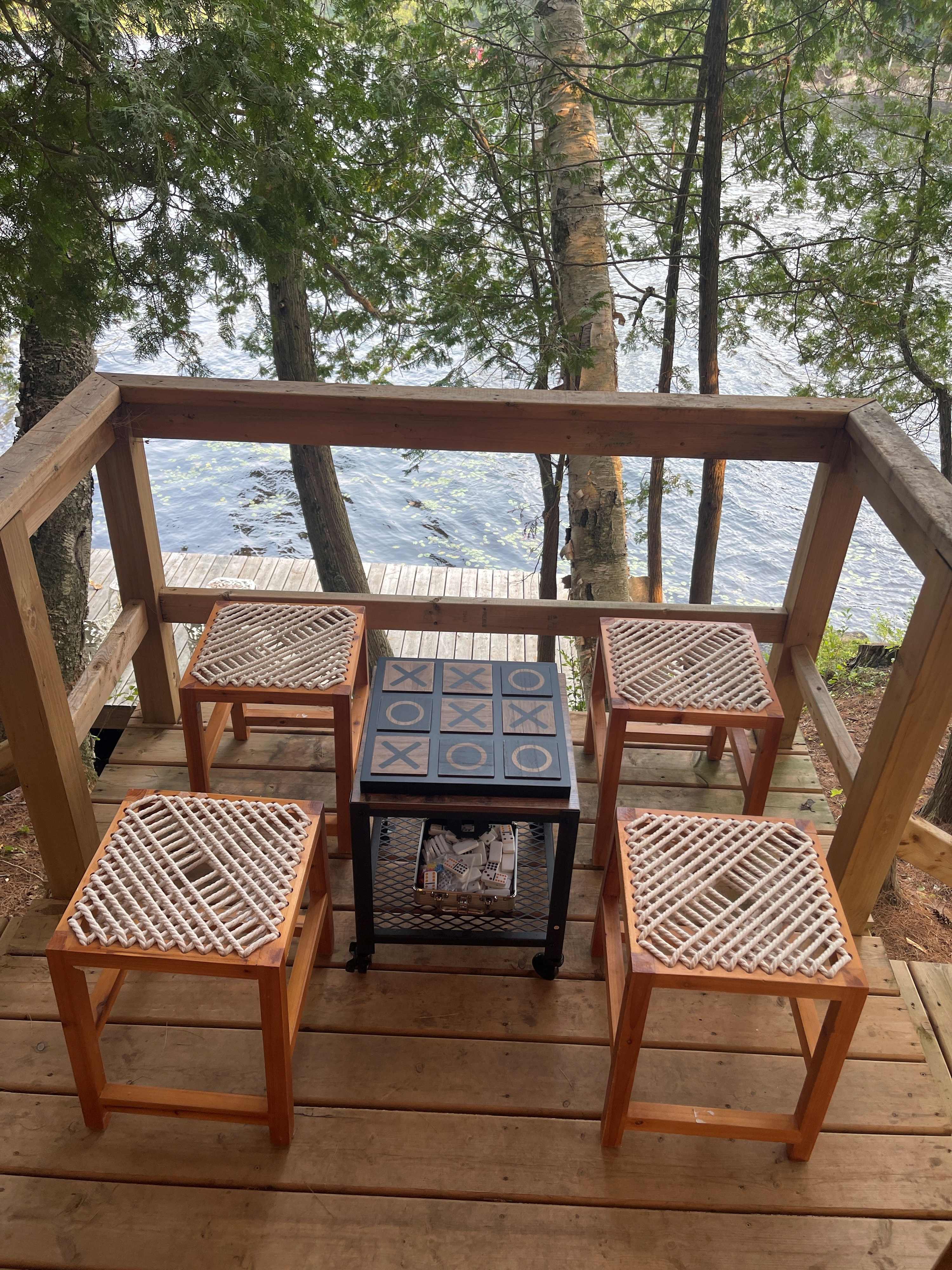 • 4 Muskoka chairs, wicker swing chair and 2 recliners at fire pit